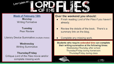 We have one more week until winter break and we have a full schedule. I shared the schedule with the students on Friday, so many of them will be working on completing missing work, finishing Lord of the Flies, and/or using the summary to review.